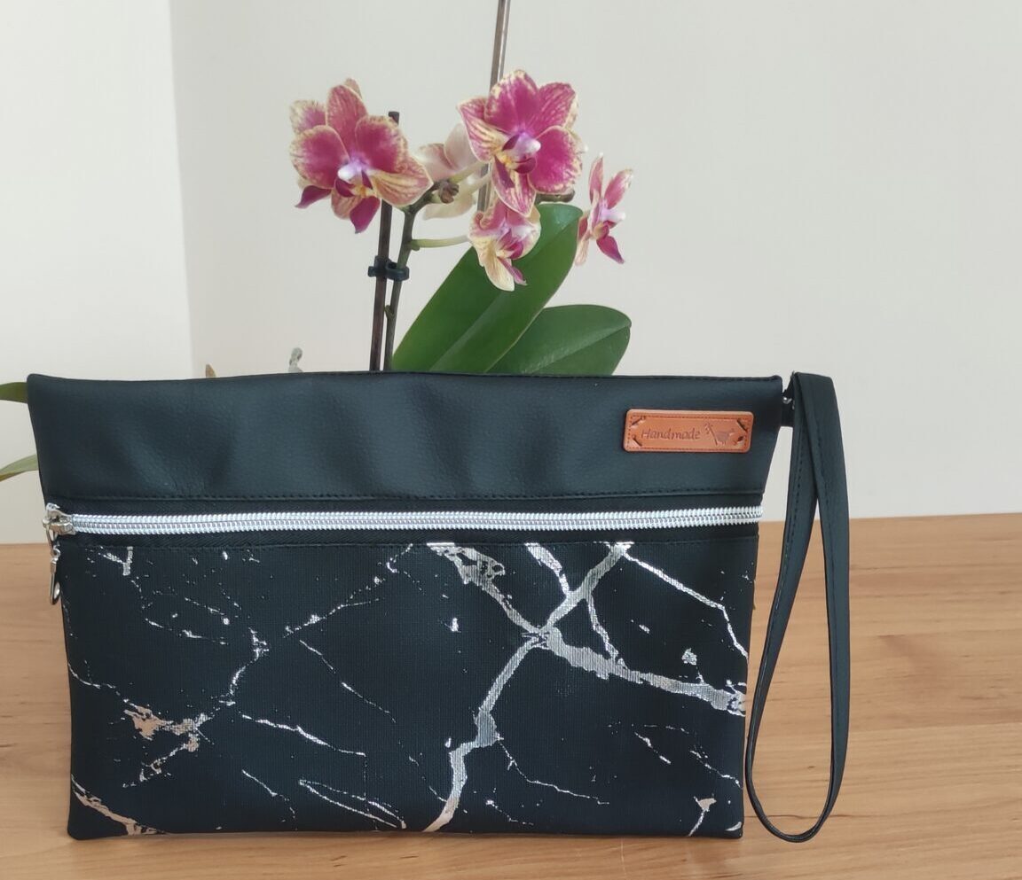 Csuklópántos táska a minimalista stílus és a különleges részletek találkozása. A fekete műbőr felsőrész és a márványmintás dekorvászon harmonikus kontrasztot alkotnak. Belsejét fényes bélésselyem borítja, így még különlegesebb érzés használni.